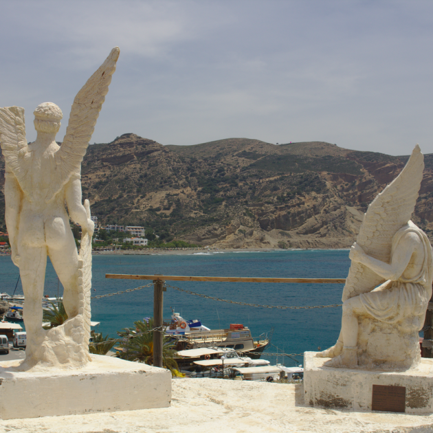 Auf der rechten Seite im Hafen von Agia Galini liegt ein Felsen, den – der Legende nach -Ikarus und Dedalus benutzt haben, um dem König Minos zu entkommen und „in die Freiheit“ zu fliegen. Dort befindet sich ein Denkmal mit den Statuen von Ikarus und Dedalus – die Aussicht von dort ist grandios.